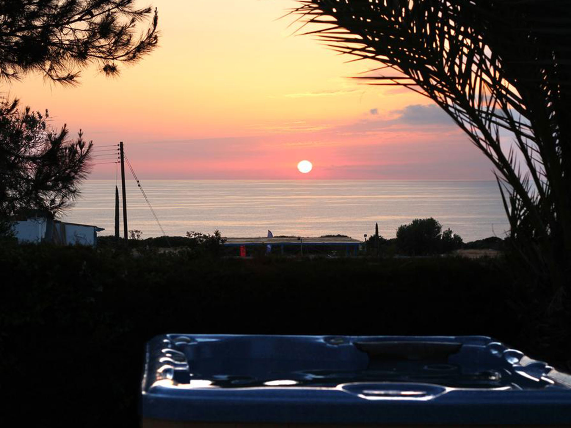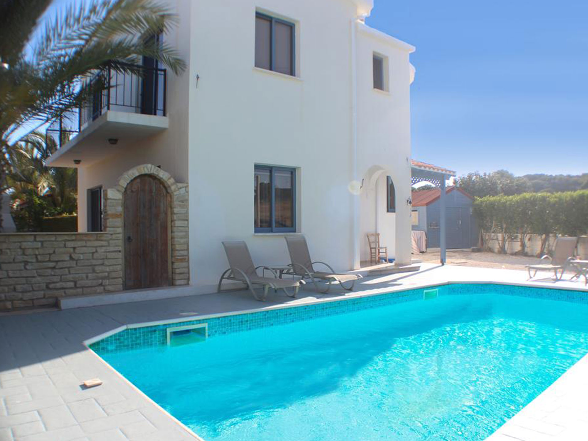 To the front is the swimming pool and sunbathing area with sunloungers and parasols.